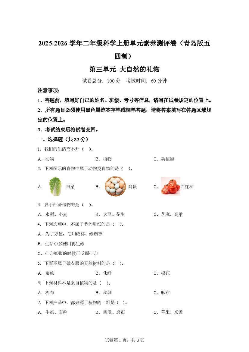 第三单元 大自然的礼物(单元测试)科学青岛版五四制二年级上册(新教材)