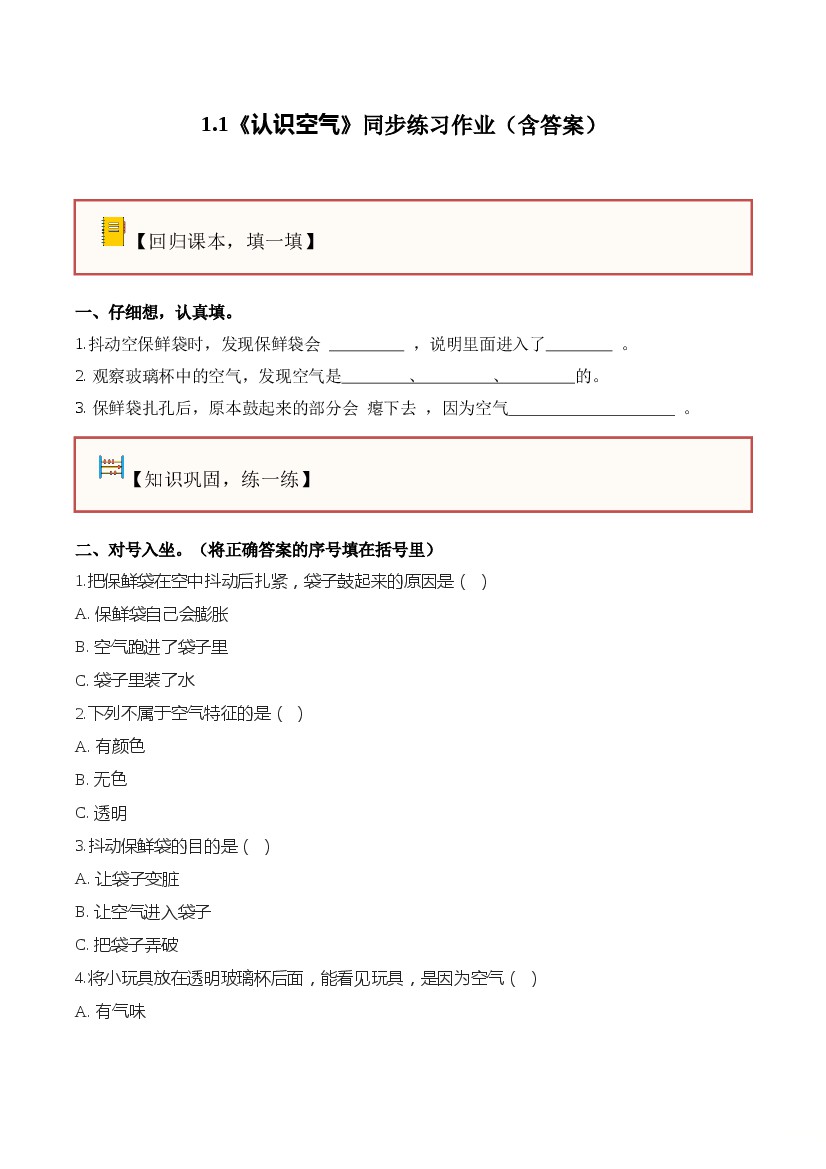2025年秋新版粤教粤科版小学科学二年级上册课时练习1
