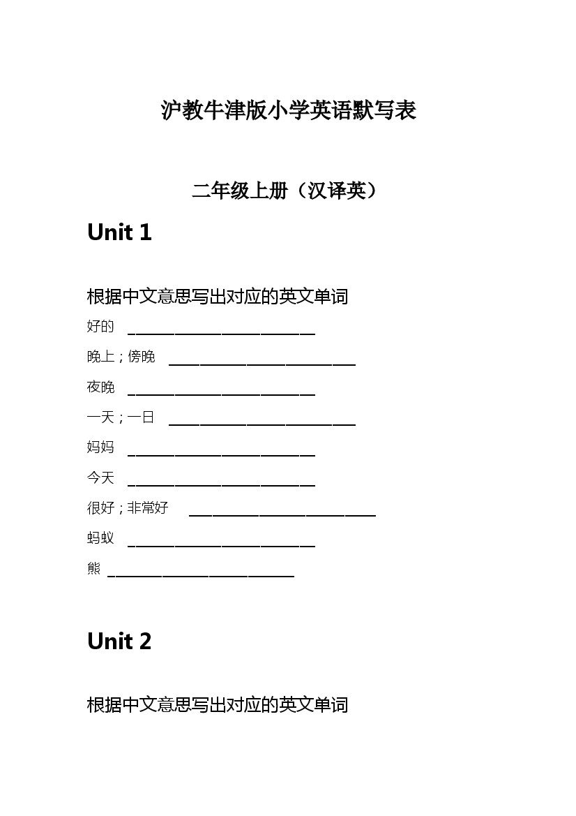 【沪教牛津】二上英语默写表 汉译英1-6年级[86页]