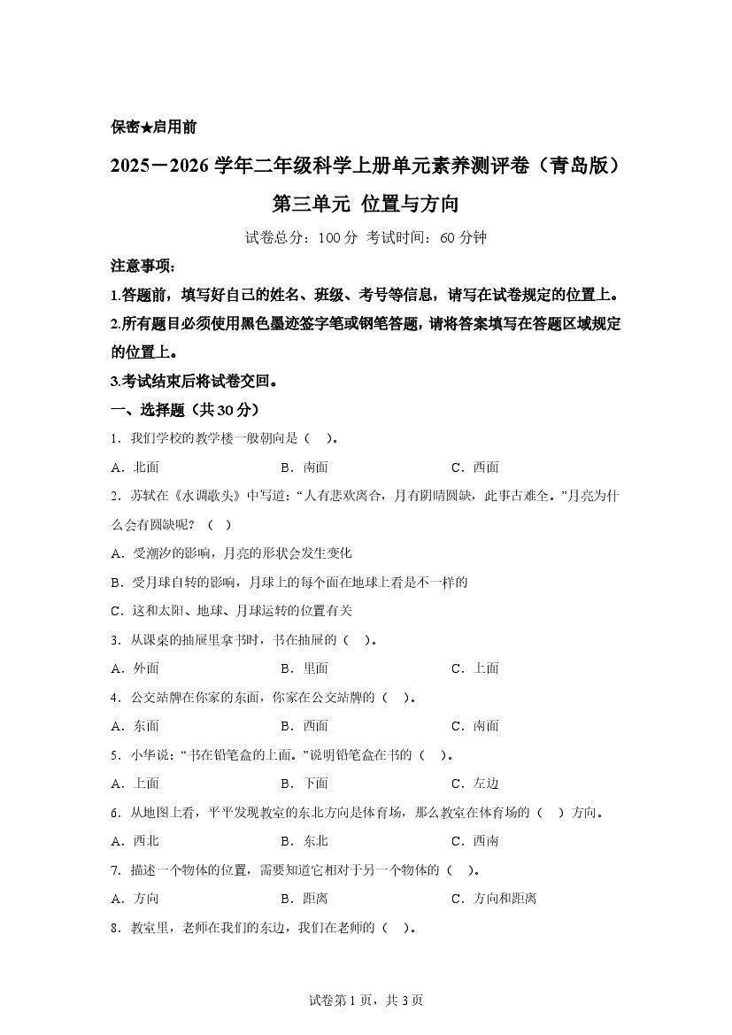 第三单元 位置与方向(单元测试)科学青岛版二年级上册(新教材)