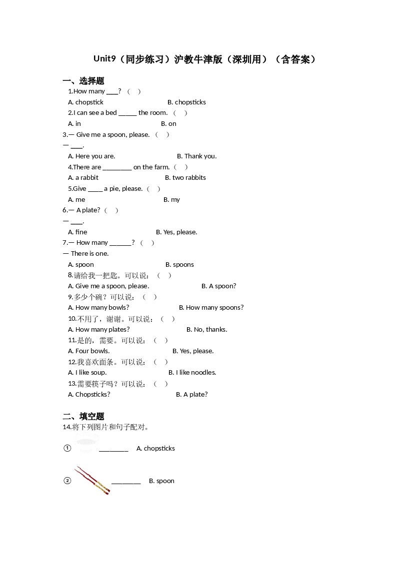 Unit 9 Dinner is ready(同步练习)-二年级英语上册-沪教牛津版(深圳用)(含答案)