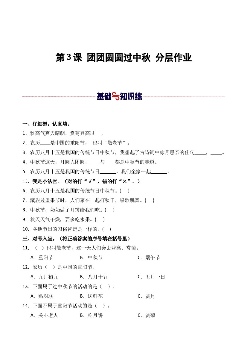 25秋二年级上册道法同步练习第3课 团团圆圆过中秋(教师版)