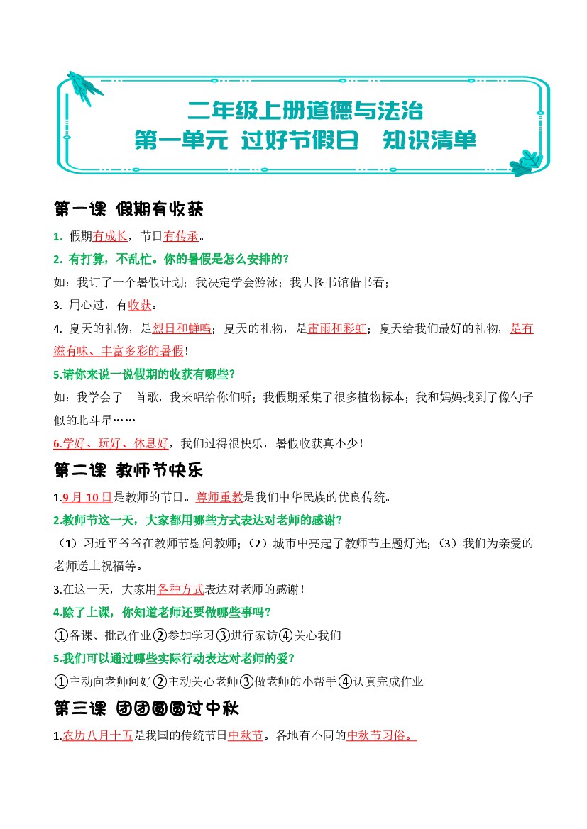 25秋二年级上册道法 第一单元过好节假日(知识清单)