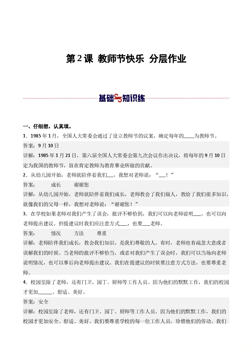 25秋二年级上册道法同步练习第2课 教师节快乐(教师版)