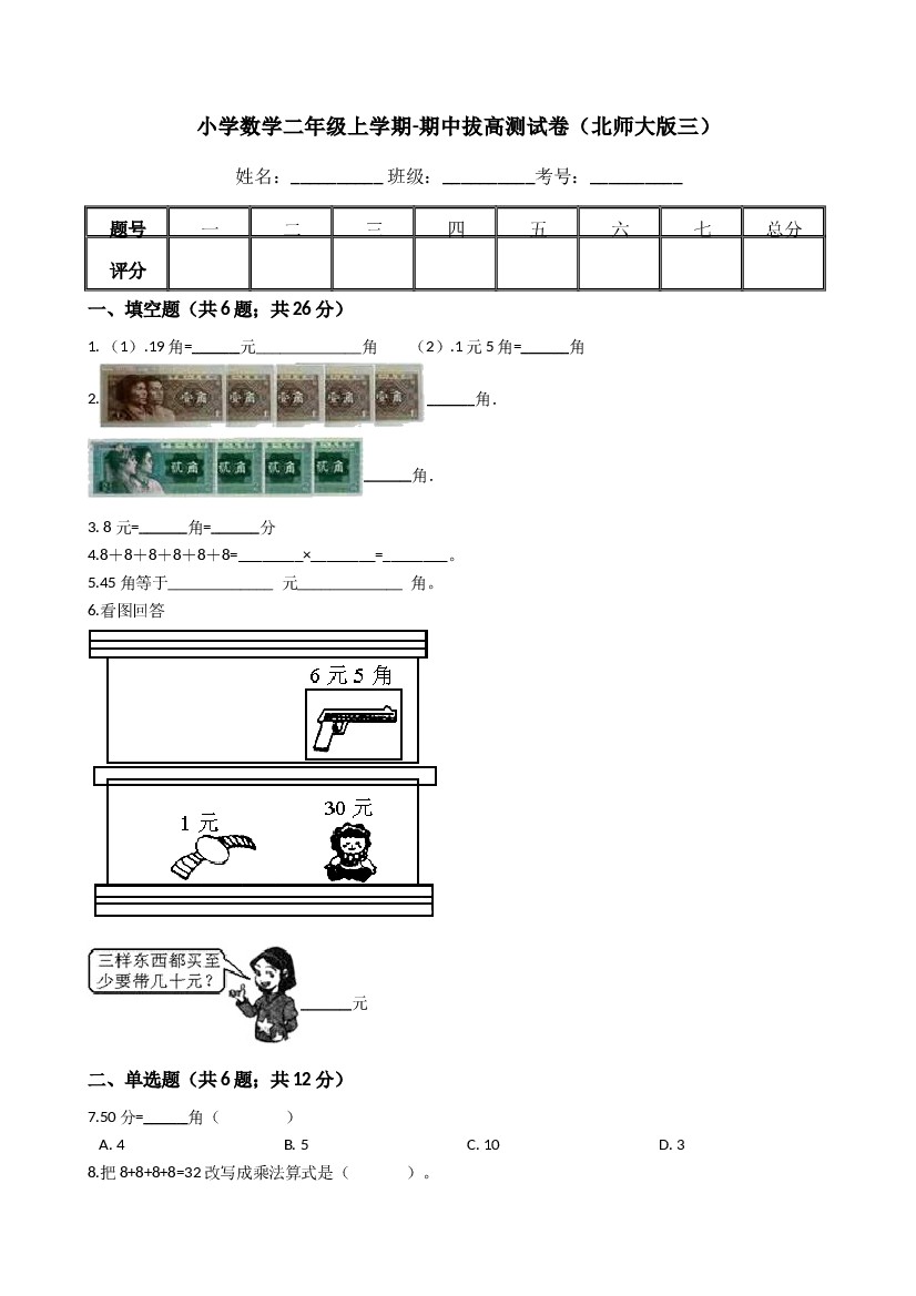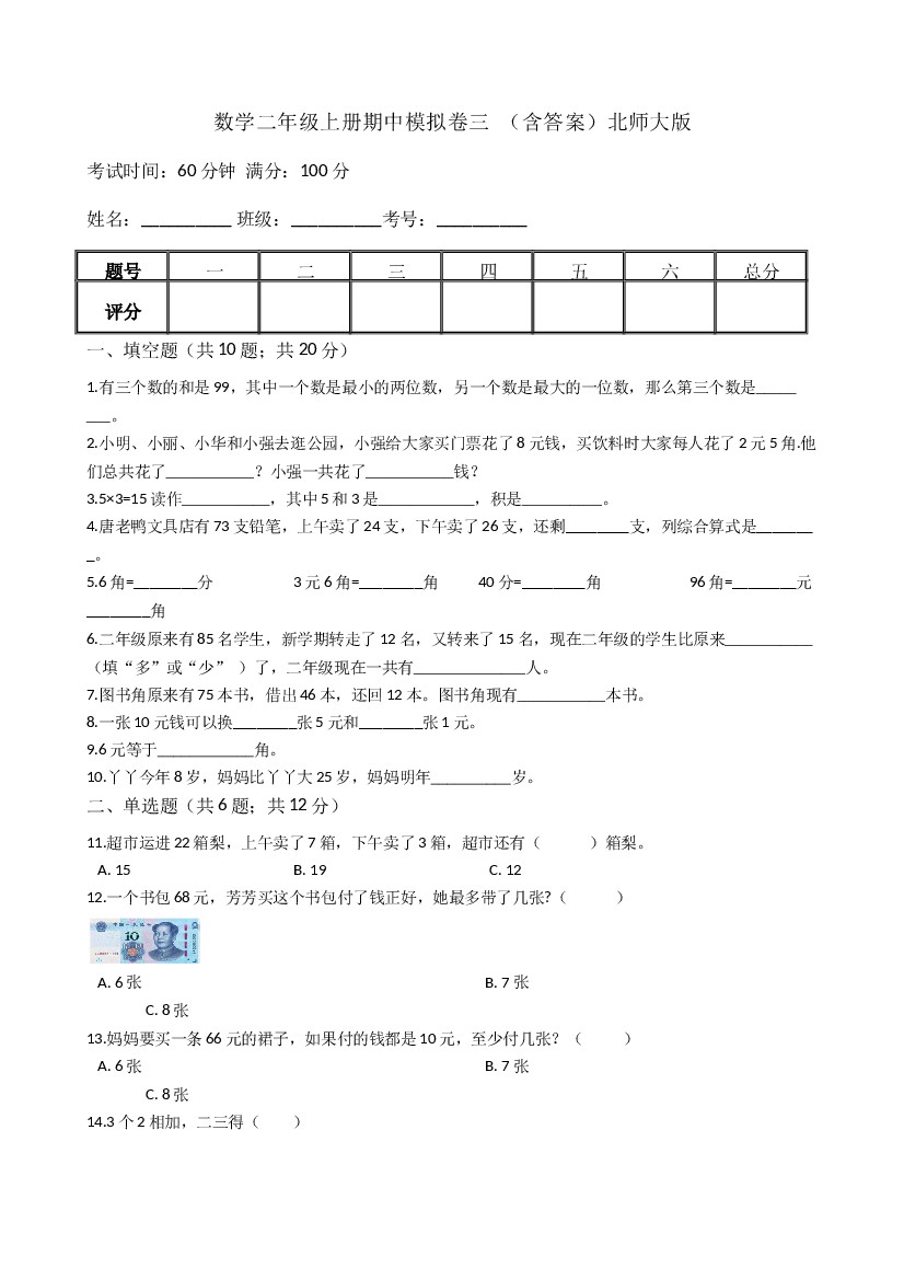 【期中模拟卷三】小学数学二年级上册-期中模拟卷三 (含答案)北师大版