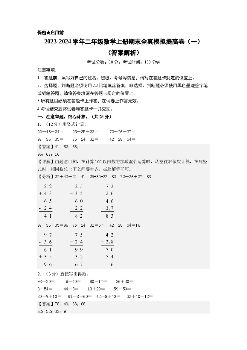 二年级数学上册期末全真模拟提高卷(一)(教师版)(北师大版)