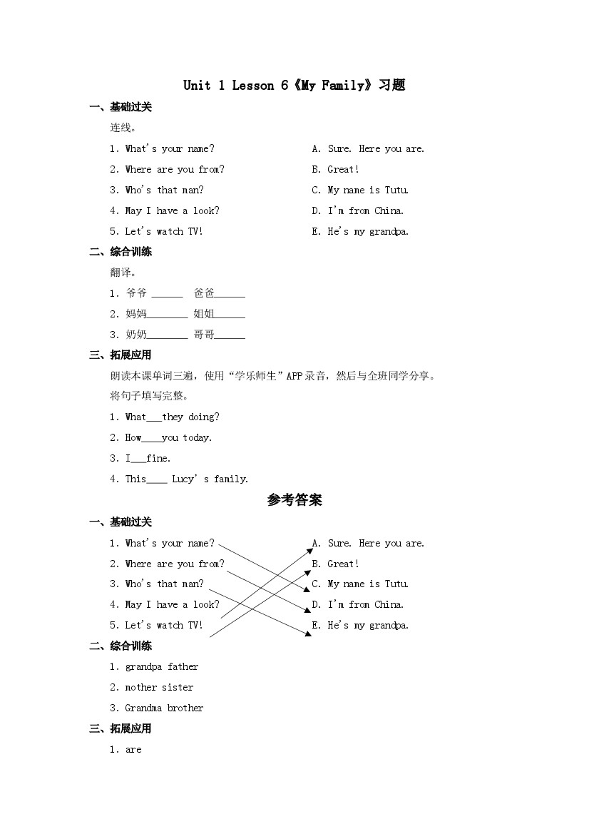 人教版二年级上册英语 第一单元能力提升卷-Unit 1 My Family (含答案)