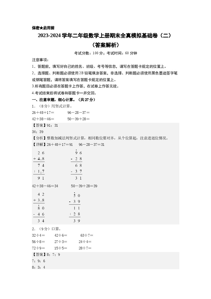 二年级数学上册期末全真模拟基础卷(二)(教师版)(北师大版)