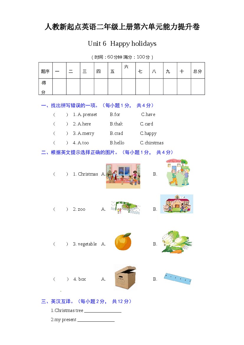 人教版二年级上册英语 第六单元能力提升卷-Unit 6 Happy holidays(含答案)