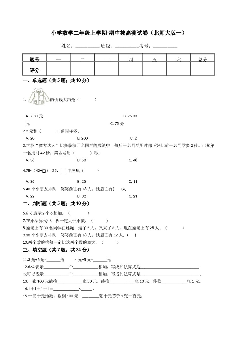 【期中模拟卷一】小学数学二年级上册-期中模拟卷一(含答案)北师大版