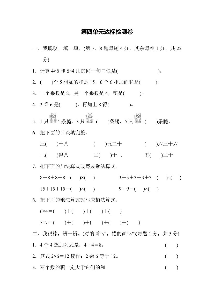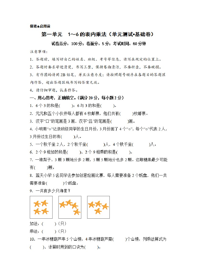 25秋二年级上册数学苏教版第一单元1~6的表内乘法(单元测试•基础卷)(A4版)