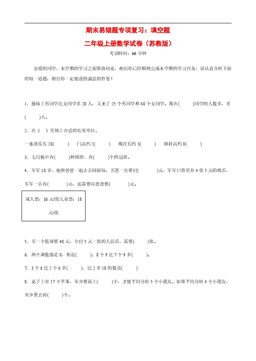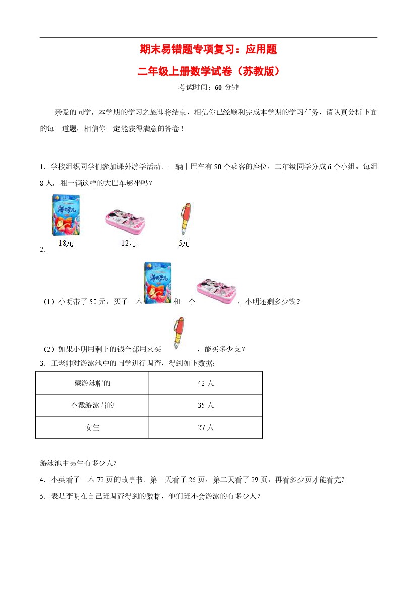二年级(上)数学 期末易错题专项复习:应用题《苏教版》