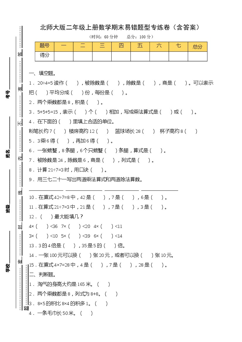 【易错专练】北师大版二年级上册数学期末易错题型专练卷(含答案)