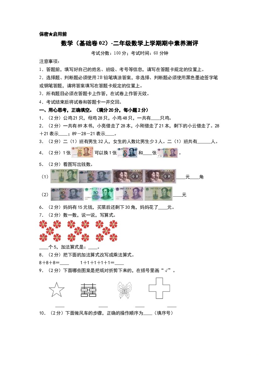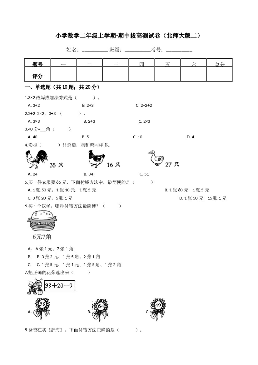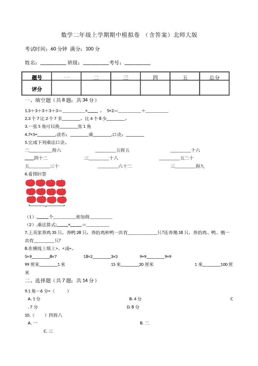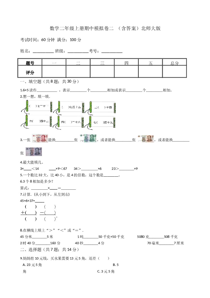 【期中模拟卷二】小学数学二年级上册-期中模拟卷二 (含答案)北师大版