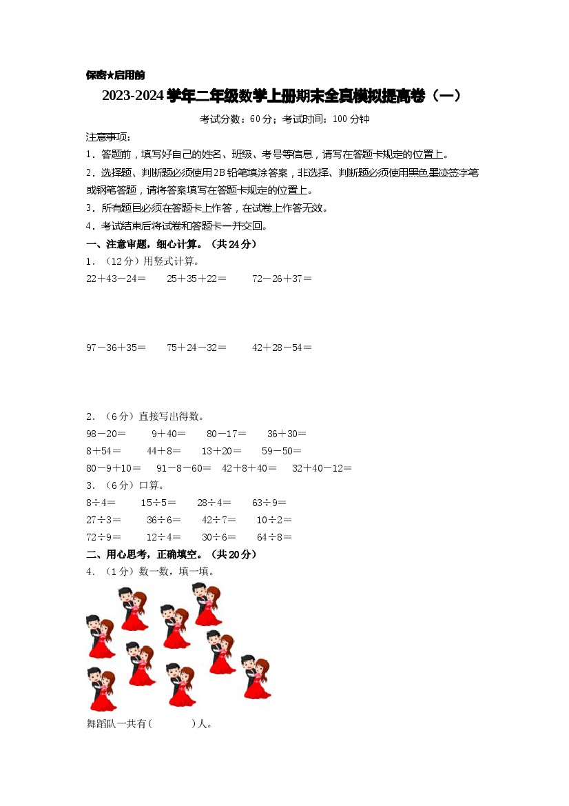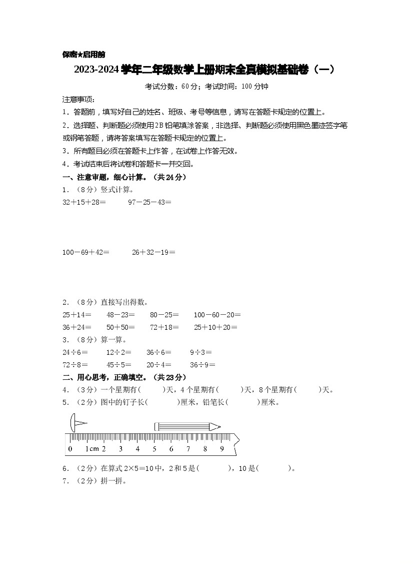 二年级数学上册期末全真模拟基础卷(一)(A4版)(北师大版)