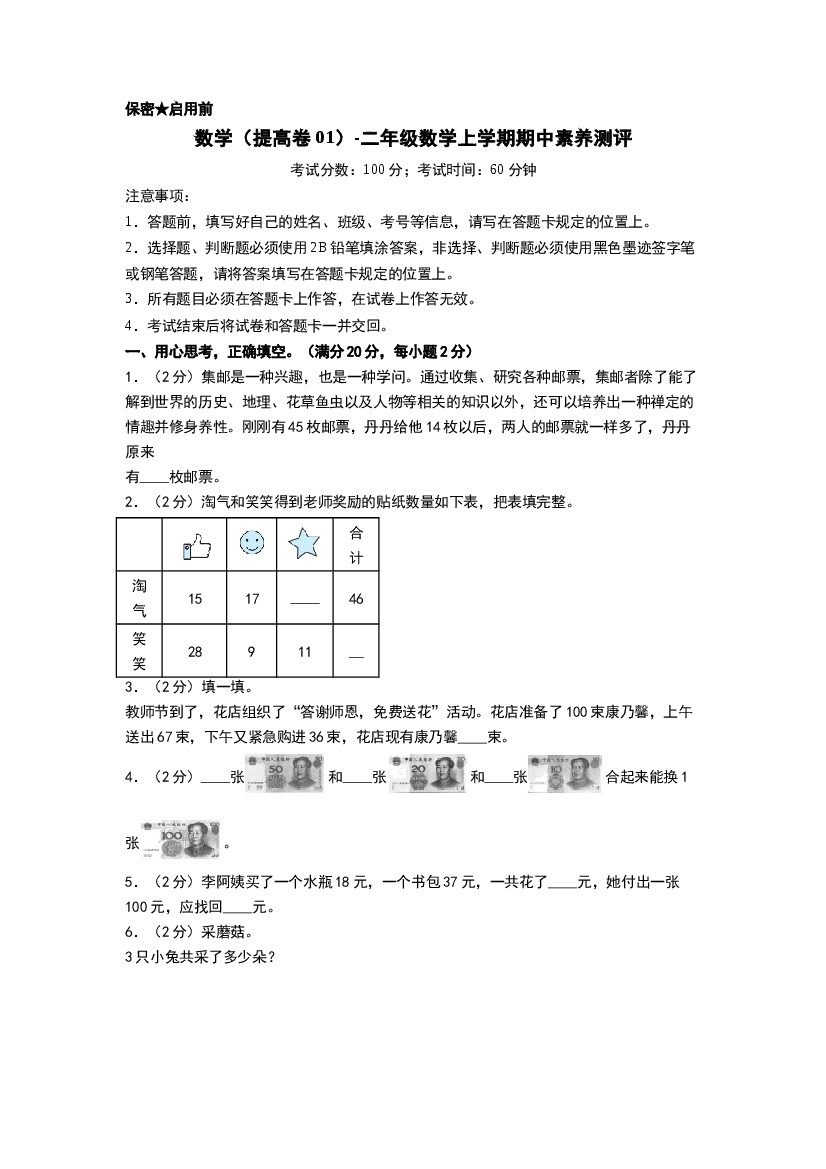 【期中拔高】小学数学二年级上册-期中拔高测试卷一(含答案、含解析)北师大版