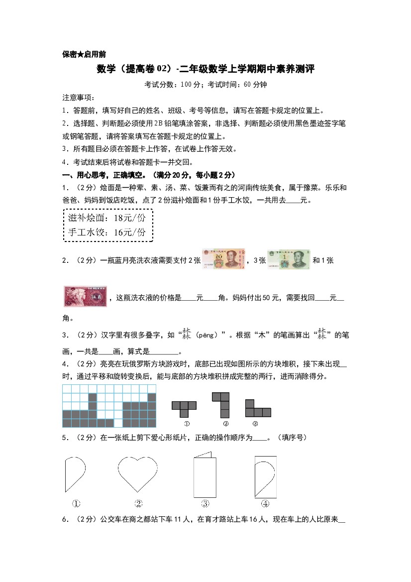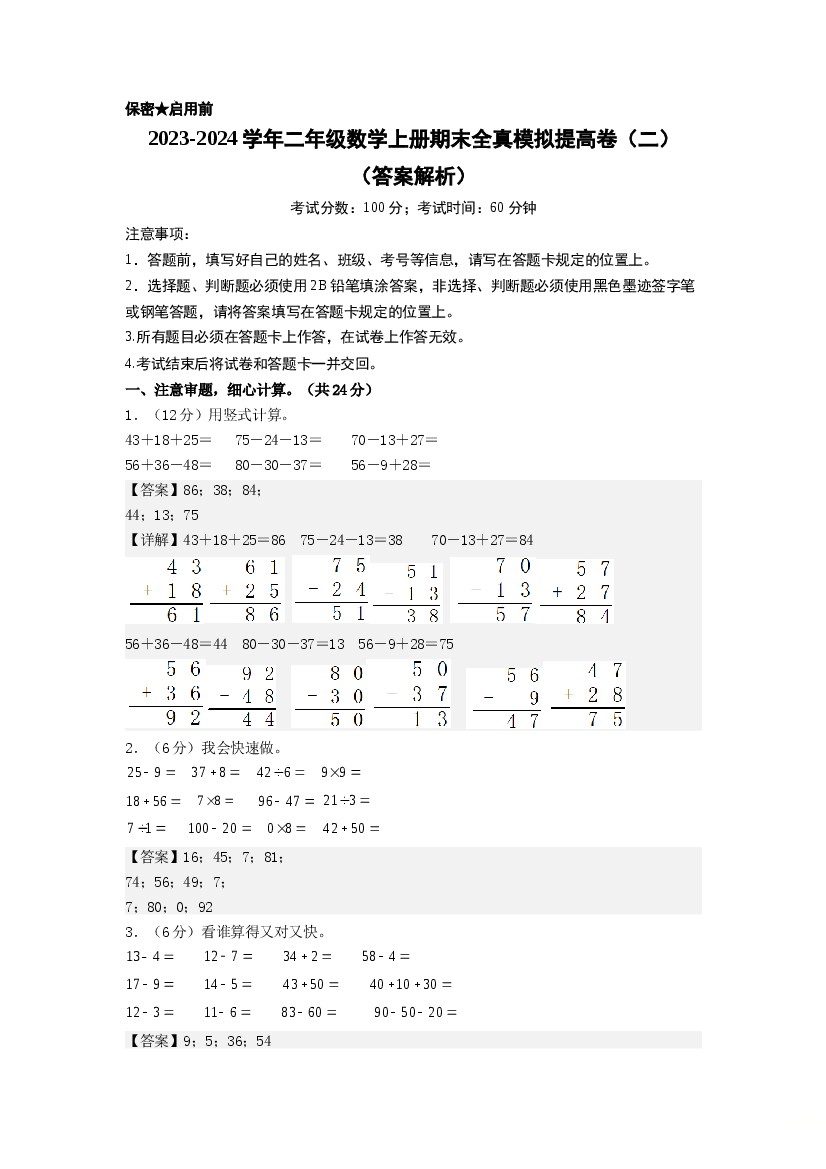 【期中拔高】小学数学二年级上册-期中拔高测试卷二(含答案、含解析)北师大版
