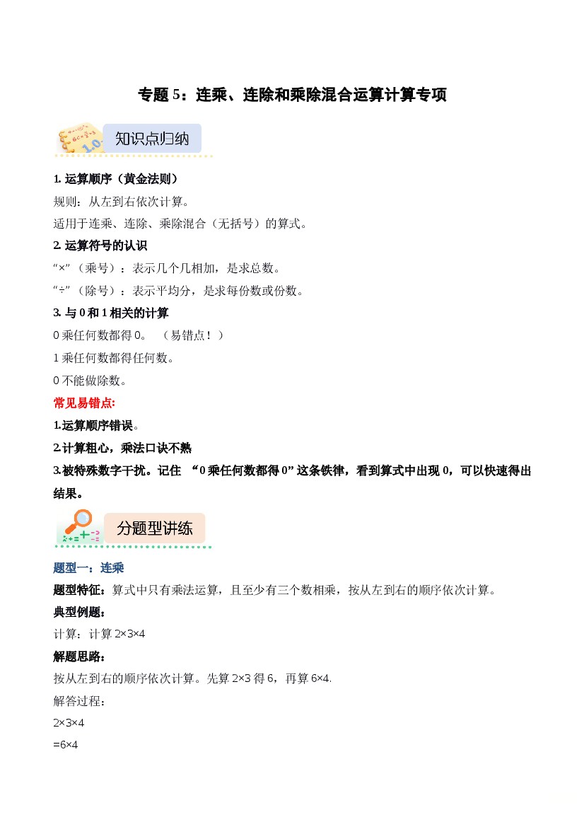 专题5 乘除混合运算法(计算专项训练)数学青岛版二年级上册(25秋新教材)
