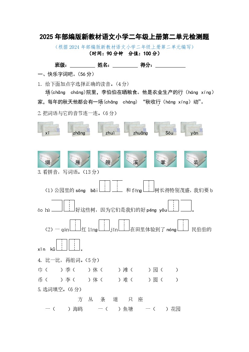 25年语文小学二年级上册第二单元检测题(含答案)