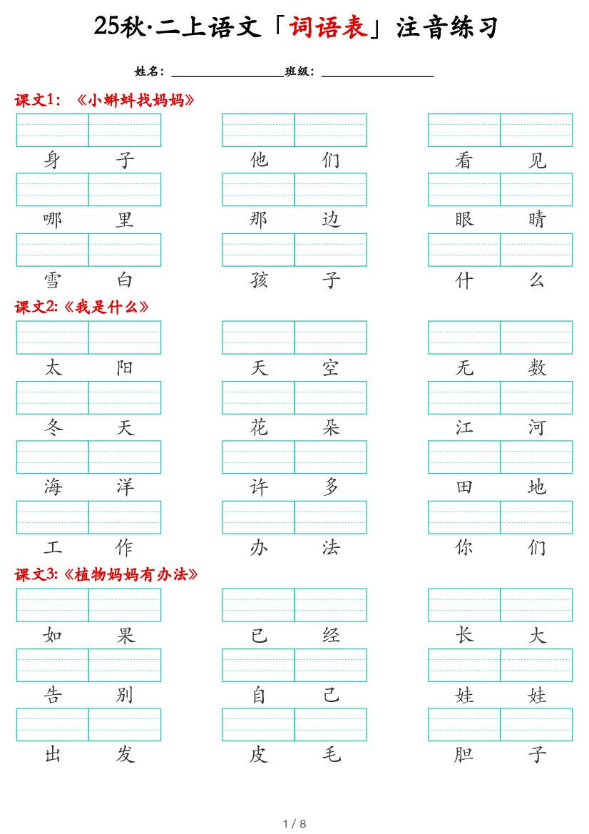 二年级上册语文《词语表看拼音写词语》(含答案18页)