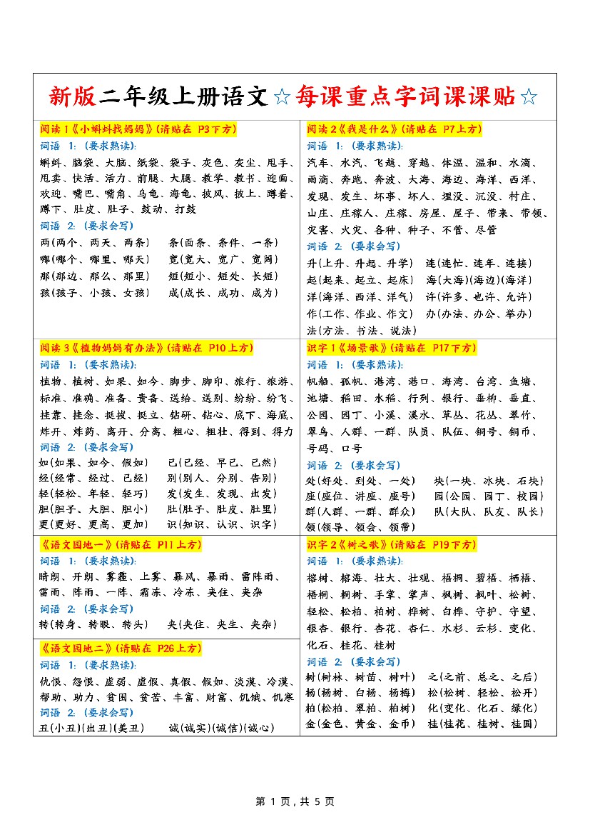 新二上语文每课重点字词课课贴(5页)