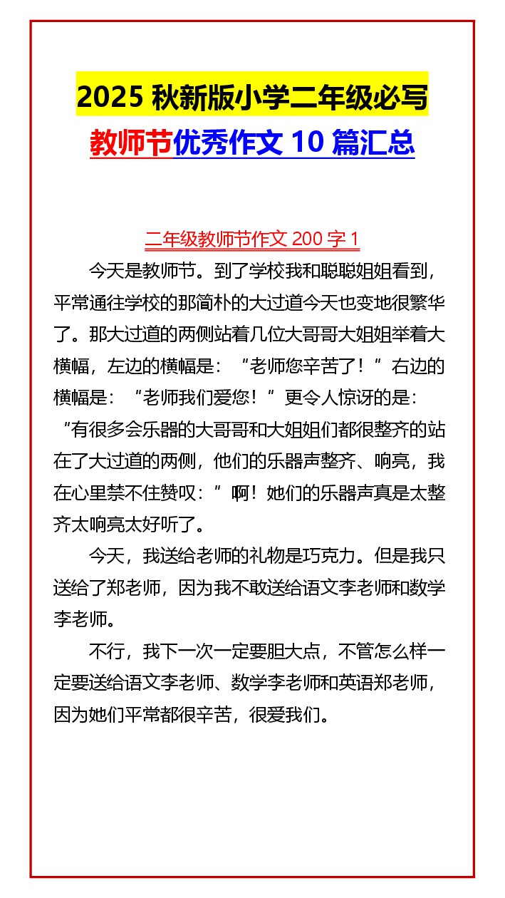 【2025秋新版】小学二年级必写 教师节优秀作文10篇汇总
