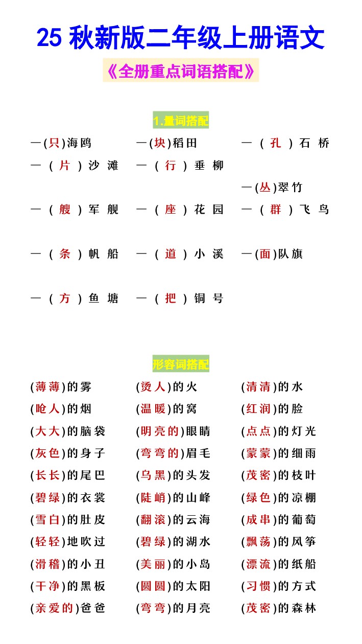 【2025秋新版】二年级上册语文 《全册重点词语搭配》