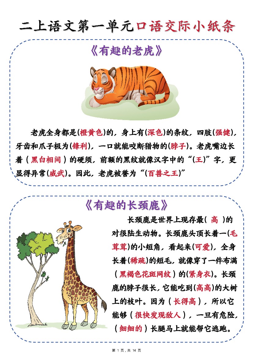 新二上语文第一单元《有趣的动物》口语交际小纸条(含空白14页)