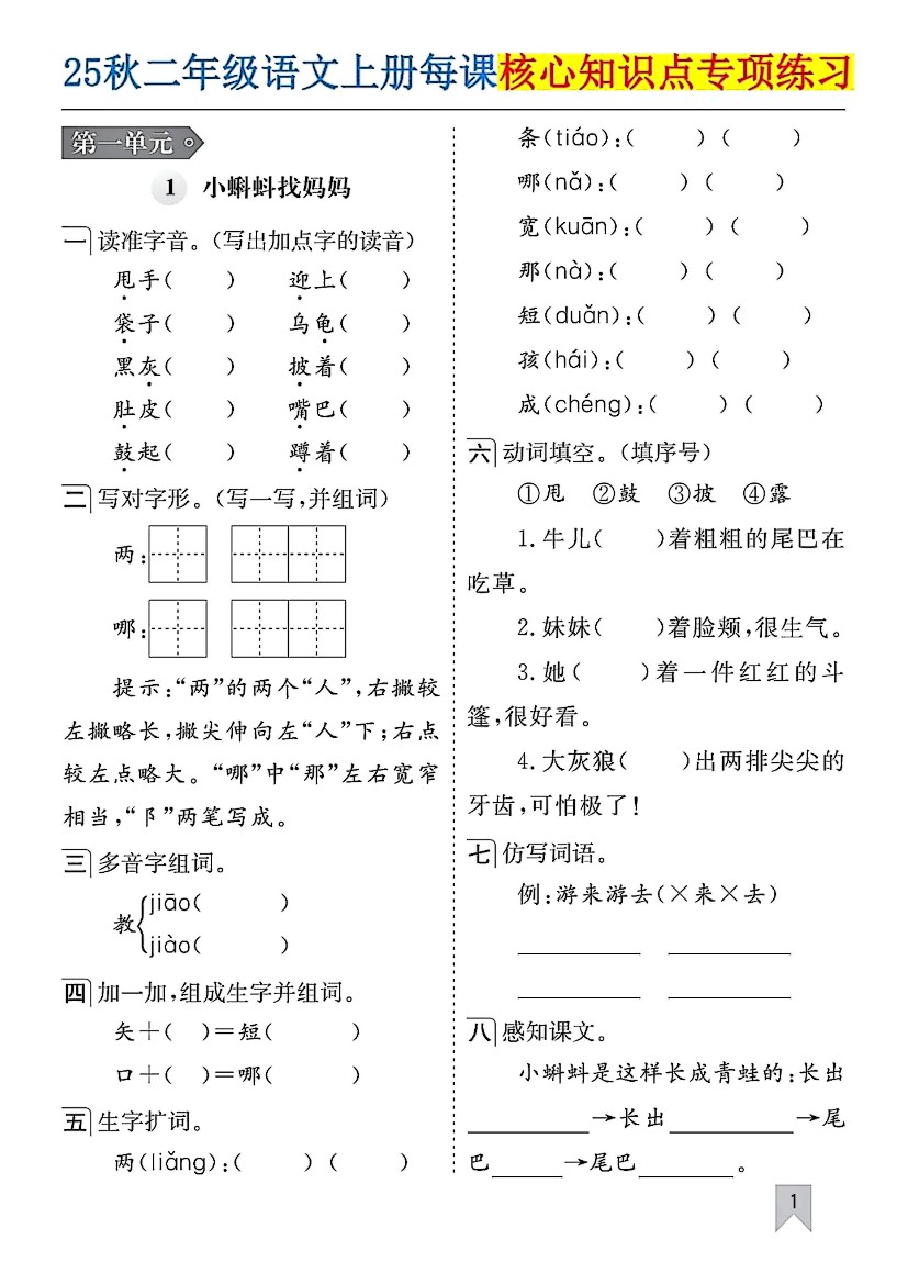 2025秋新版二年级上册语文一课一练1-8单元(含答案)