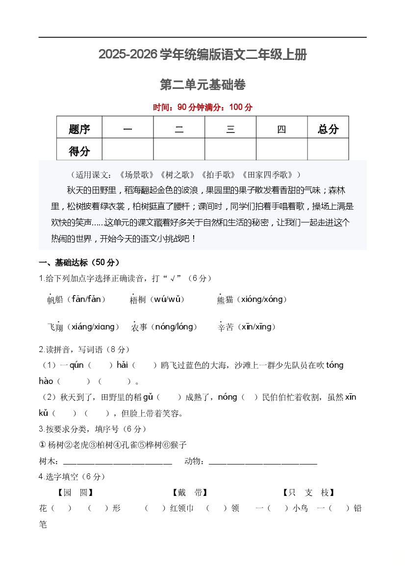 25秋新二年级上册语文第二单元 认识事物,归类识字(单元测试·基础卷)