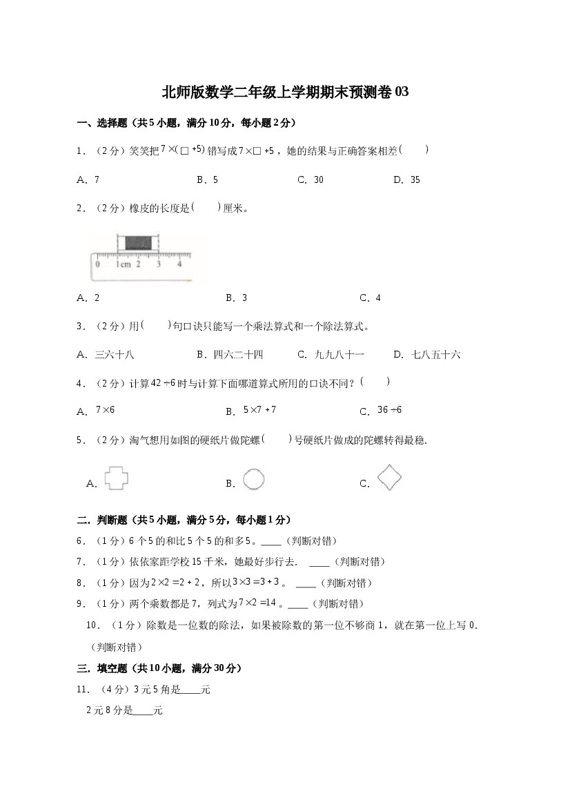 二年级数学上册期末全真模拟提高卷(一)(A4版)(北师大版)