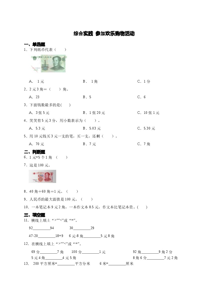 北师大版二年级上册综合实践《参加欢乐购物活动》单元检测卷(含答案)