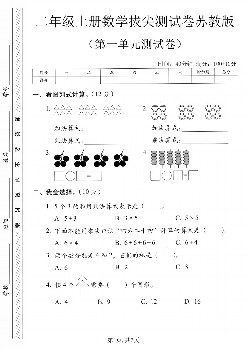 25秋二年级上册数学苏教版第一单元1~6的表内乘法(单元测试•基础卷)(A4版)