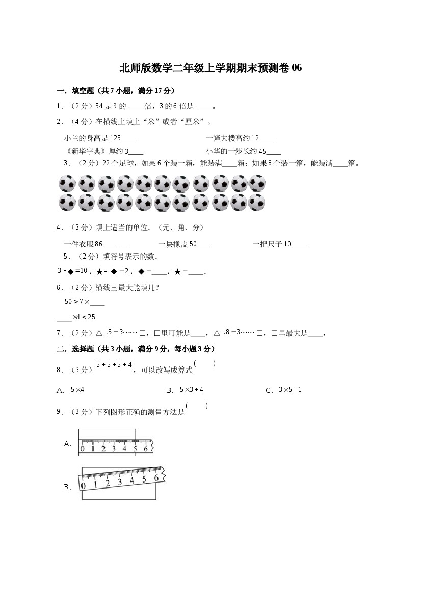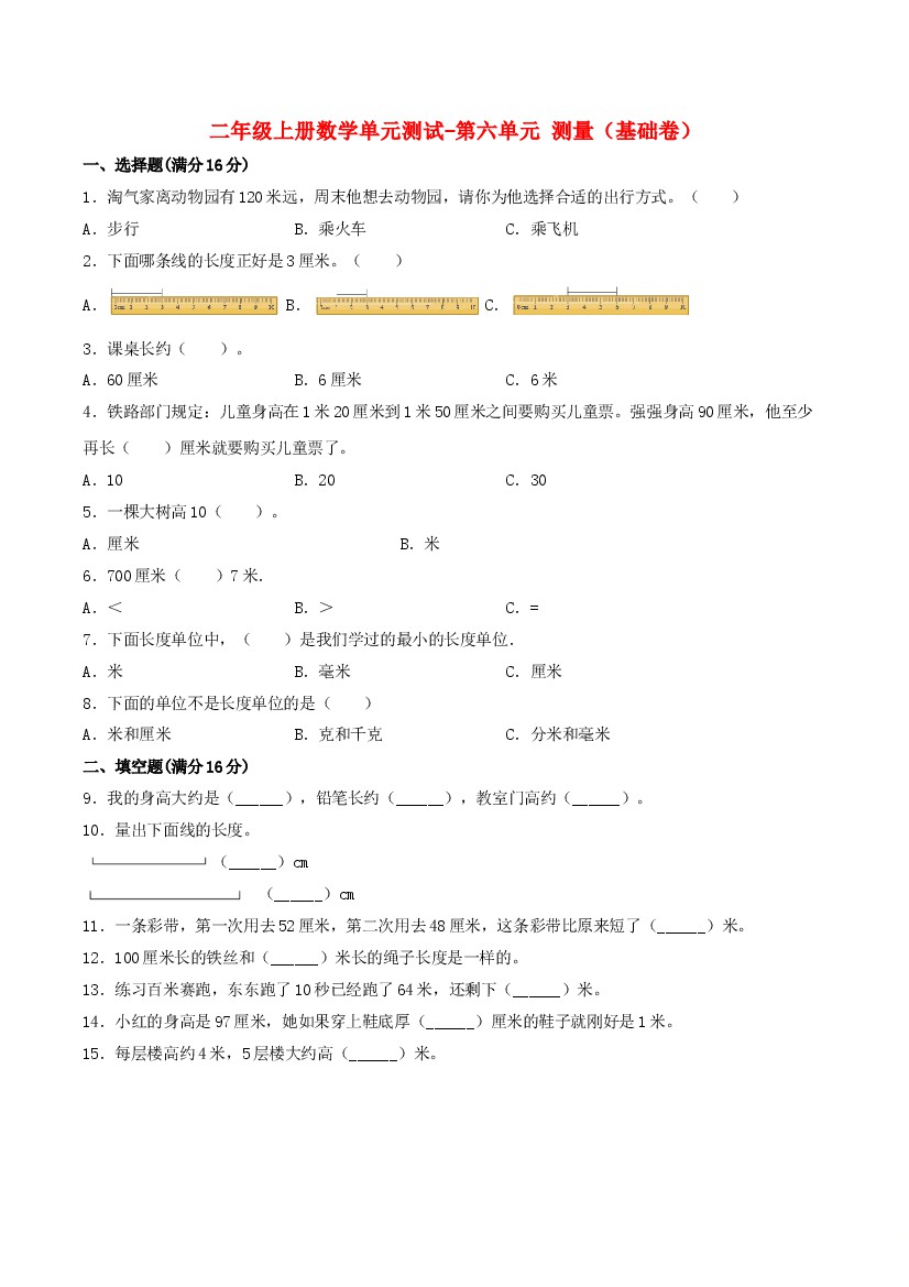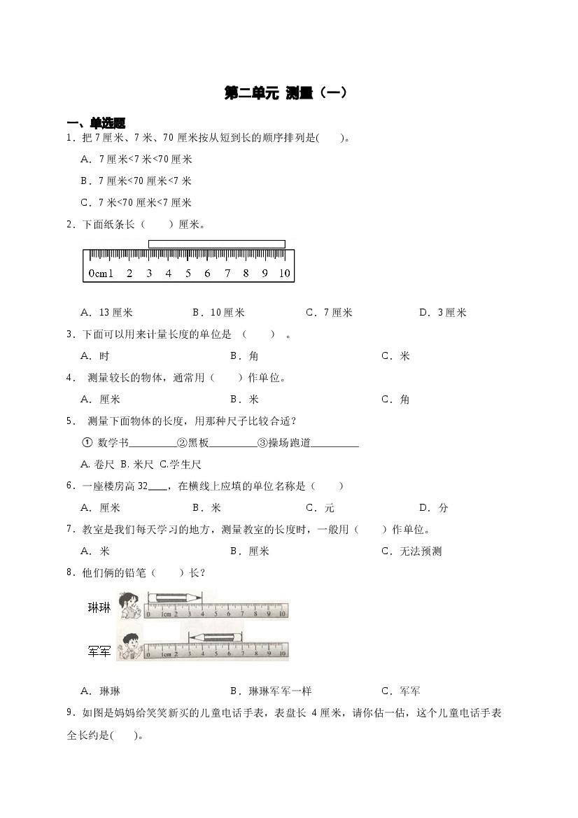 北师大版二年级上册第二单元《测量(一)》单元检测卷(含答案)