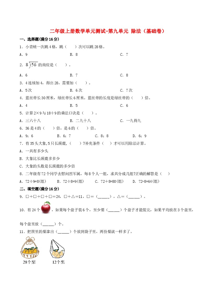 25秋二年级上册数学苏教版第二单元1~6的表内除法(单元测试•基础卷)(A4版)含答案解析