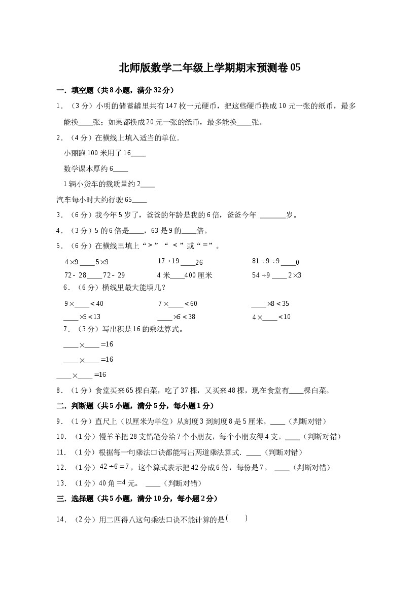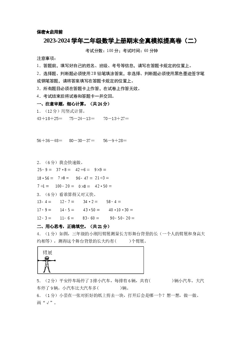 二年级数学上册期末全真模拟提高卷(二)(A4版)(北师大版)