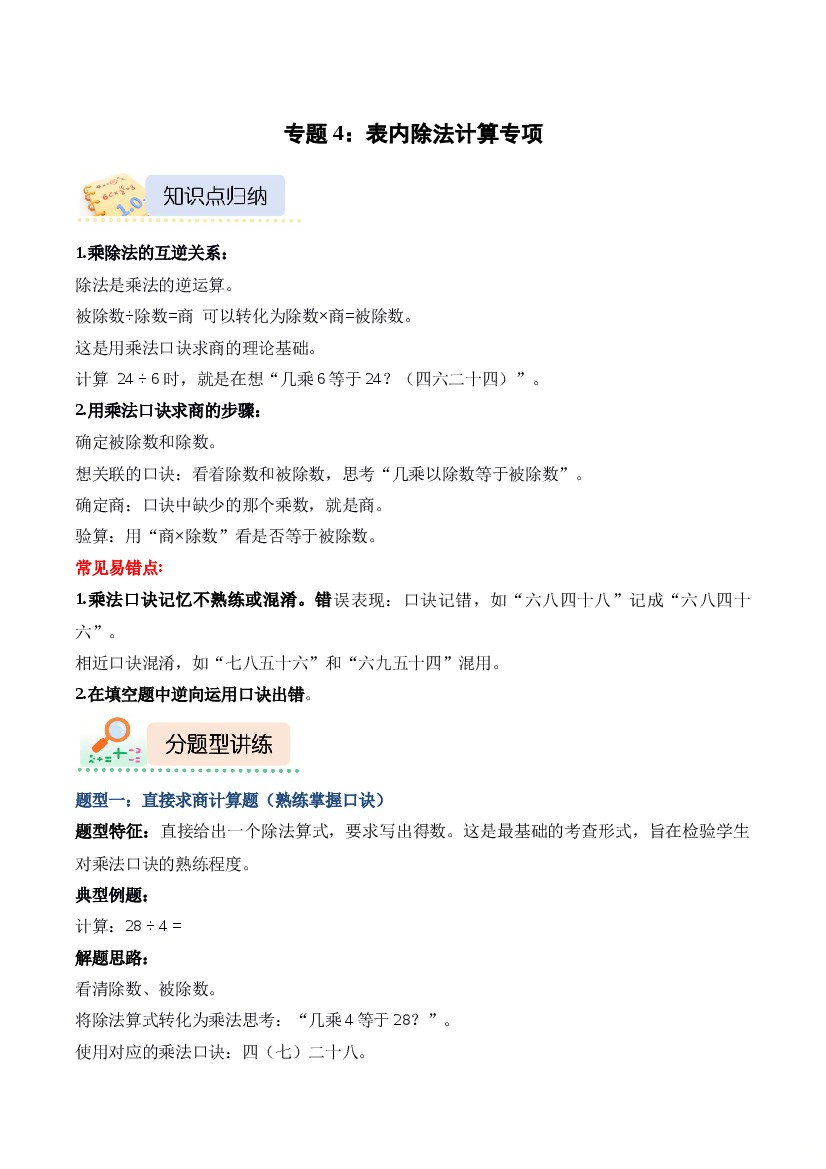 专题4 表内除法(计算专项训练)数学青岛版二年级上册(25秋新教材)