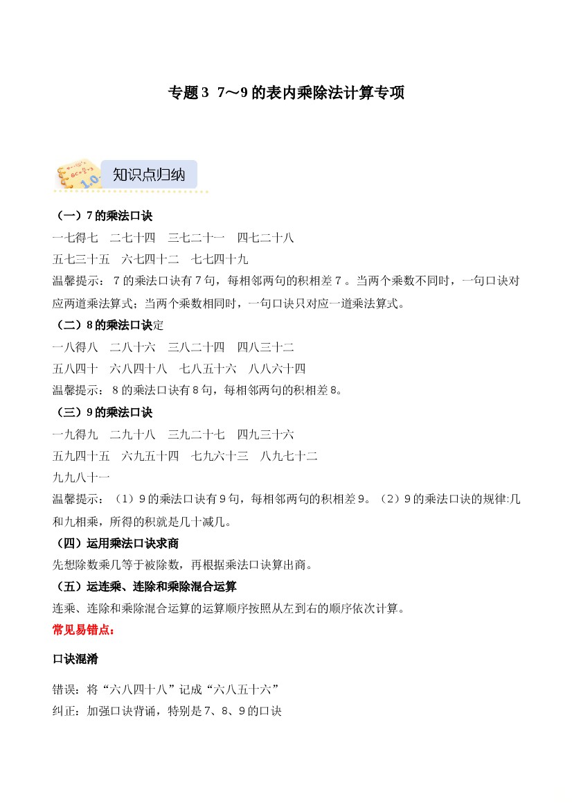 【计算专项】25秋二年级上册数学苏教版专题3 7~9的表内乘除法(计算专项训练)