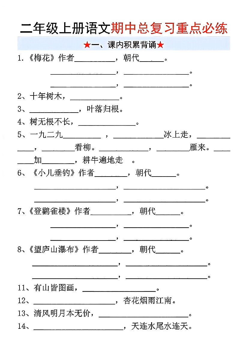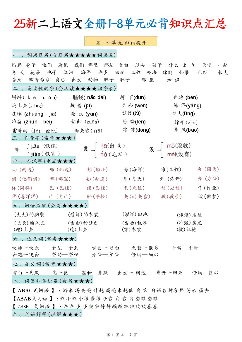 【25新二上语文1-8单元必背知识点汇总(17页)