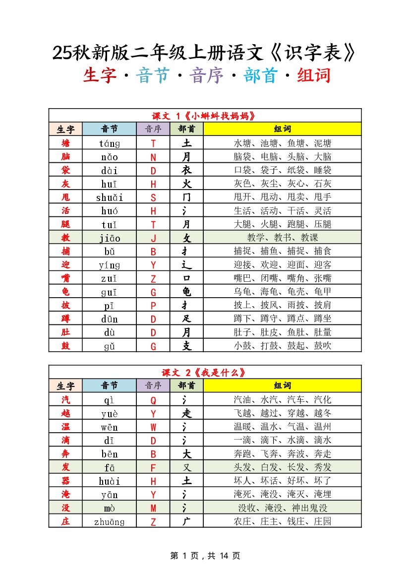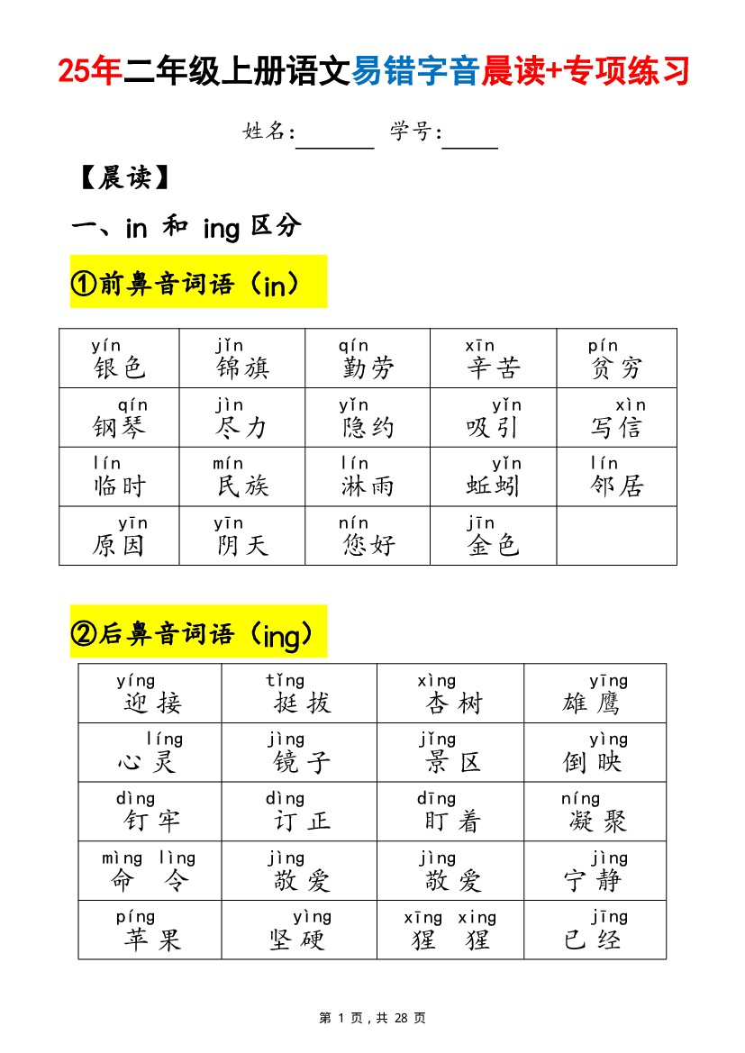 25年二年级上册语文《易错字音(晨读+专项练习)》(含答案28页)