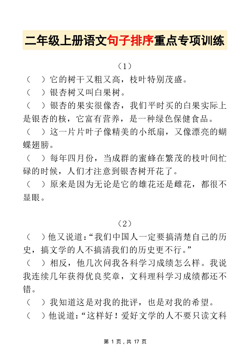 二上语文句子排序重点专项训练30道(含答案17页)排列句子