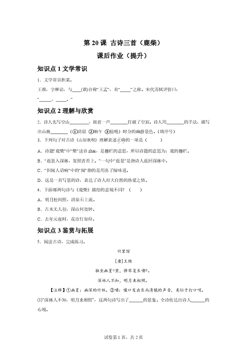 25年秋【三上语文】第20课 古诗三首(鹿柴)课后作业(提升)