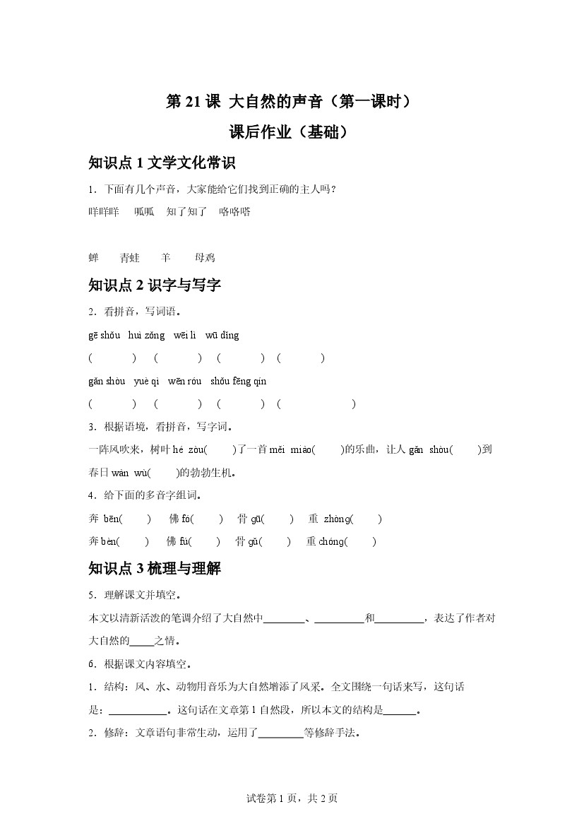 25年秋【三上语文】第21课 大自然的声音(第一课时)课后作业(基础)