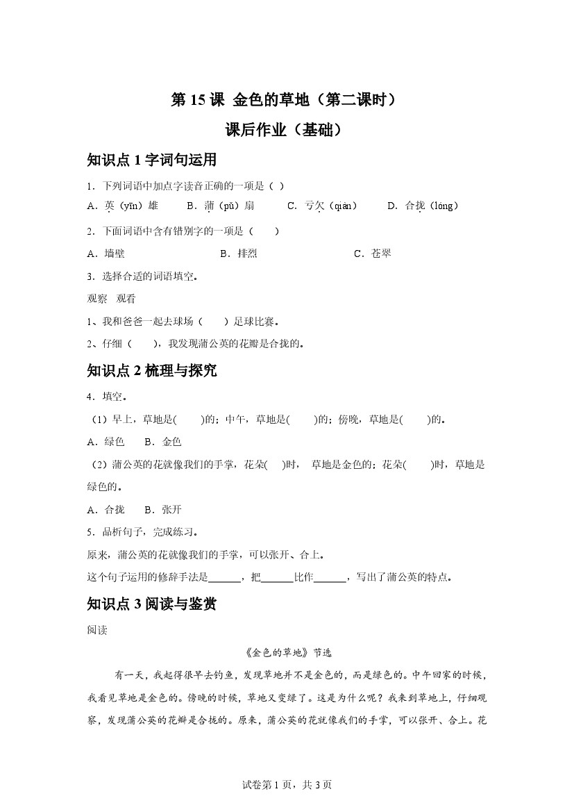 25年秋【三上语文】第15课 金色的草地(第二课时)课后作业(基础)