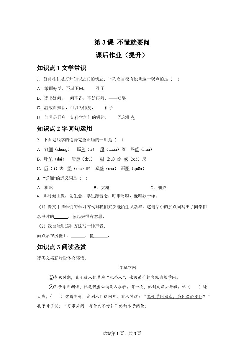 25年秋【三上语文】第3课 不懂就要问课后作业(提升)