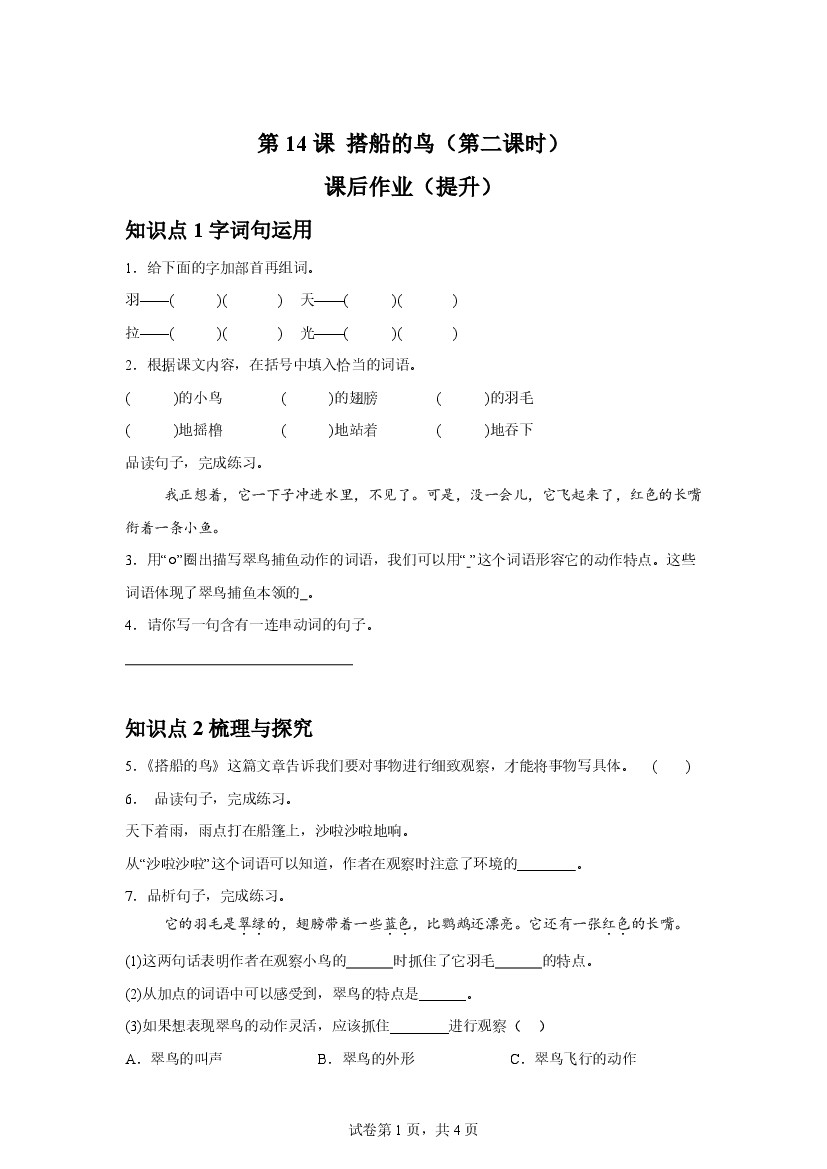 25年秋【三上语文】第14课 搭船的鸟(第二课时)课后作业(提升)