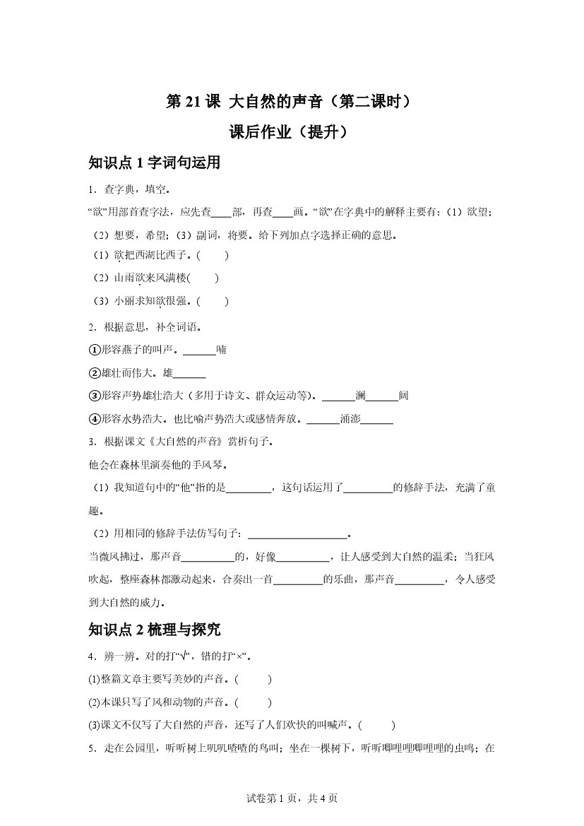 25年秋【三上语文】第21课 大自然的声音(第二课时)课后作业(提升)
