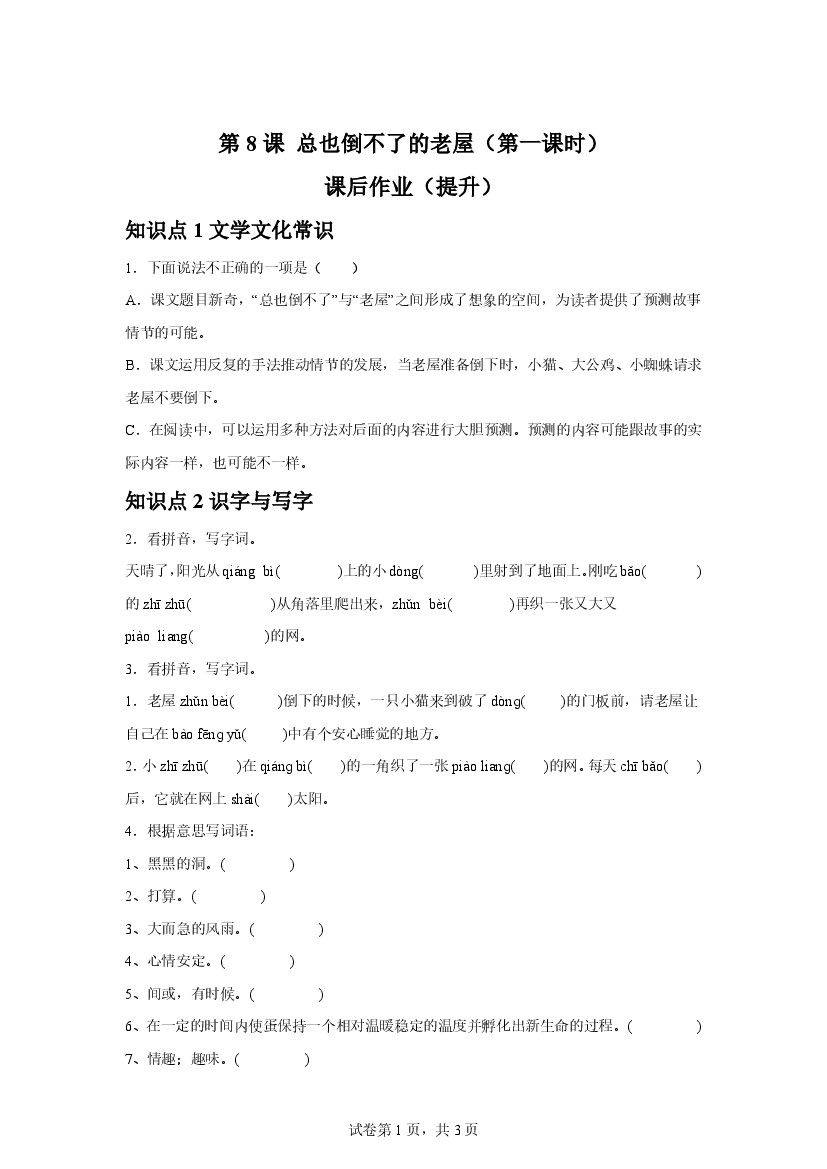 25年秋【三上语文】第8课 总也倒不了的老屋(第一课时)课后作业(提升)