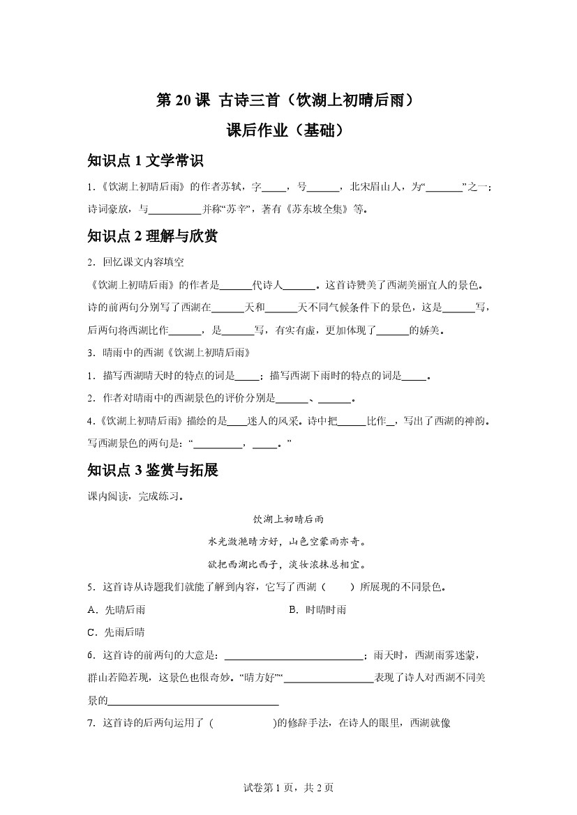 25年秋【三上语文】第20课 古诗三首(饮湖上初晴后雨)课后作业(基础)