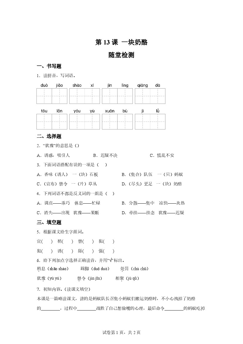 25年秋【三上语文】第13课 一块奶酪随堂检测